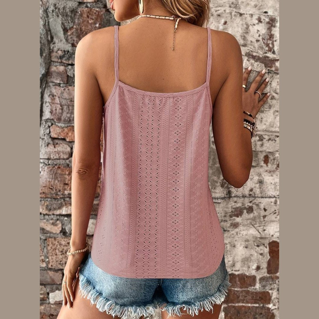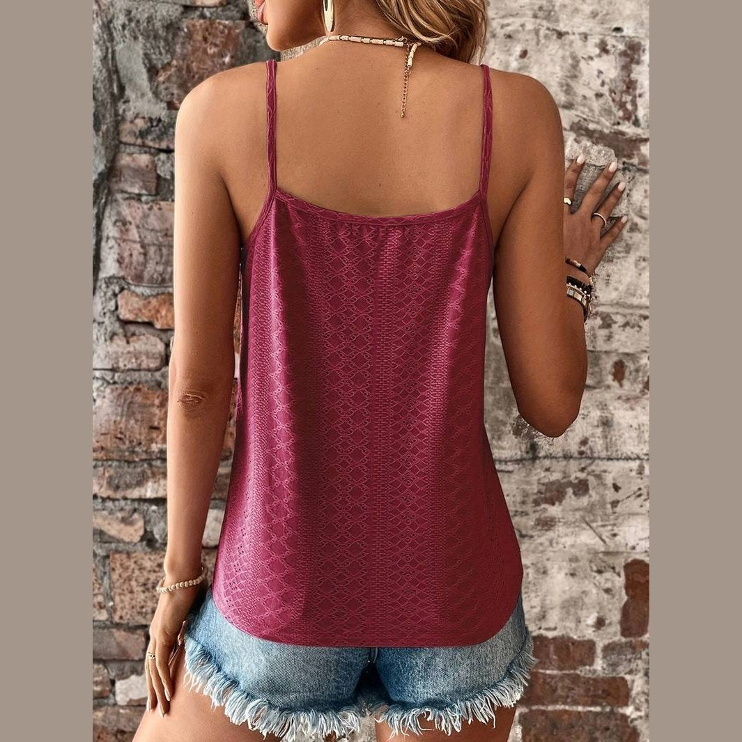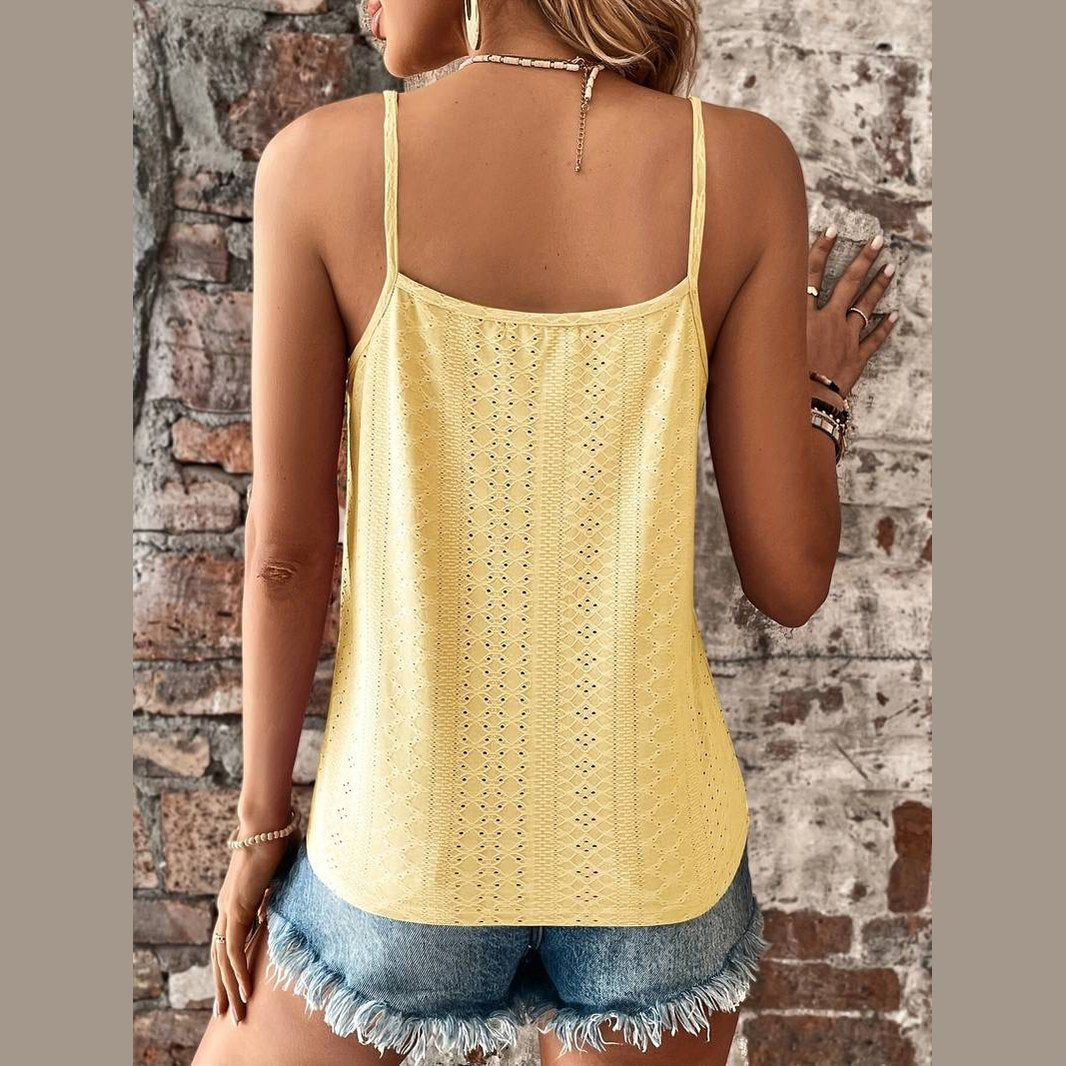 Découvrez l'essence du style et de l'élégance avec le haut en dentelle Gigi, un vêtement soigneusement conçu pour vous offrir le look que vous désirez. Élevez votre garde-robe estivale avec ce top en dentelle orné de détails en œillets, d'un décolleté en V décontracté et de fines bretelles spaghetti pour un look délicat et féminin. Ce haut est indispensable pour toute passionnée de mode.
