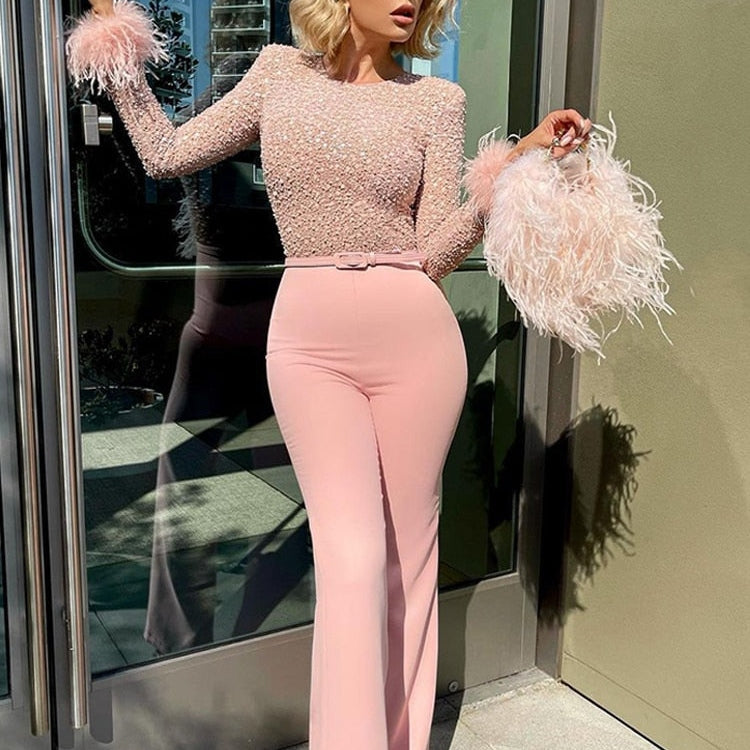 Découvrez Philomène, la combinaison à paillettes et plumes qui ne passera pas inaperçue. Cette pièce saisissante est conçue pour briller sous les projecteurs, avec ses manches longues délicatement ornées de plumes et son encolure ronde d'une élégance raffinée, assortie d'une ceinture assortie pour une silhouette parfaitement mise en valeur.